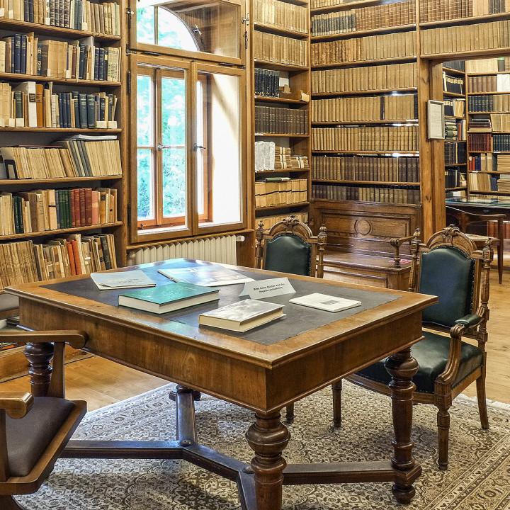 Zu Recht wird Wilhelm Ostwald als Universalgelehrter bezeichnet – erkennbar wird dies nicht zuletzt an seiner vielseitigen Forschungsliteratur, die er selbst herausgab aber auch in großer Zahl sammelte. In der original erhaltenen, etwa 24.000 Titel umfassenden Bibliothek, können Sie in die Atmosphäre der Zeit Wilhelm Ostwalds eintauchen. In diesem Sinne verzichten wir hier auf großformatige Texttafeln. Über den Aufbau und die Struktur der Bibliothek können Sie sich Mittels kleiner Handreichungen informieren.