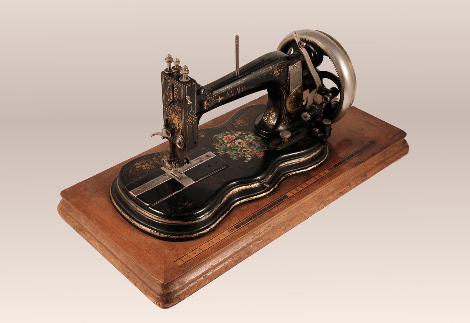 Im Museum befindet sich eine mit farbigem und goldenem Blütendekor verzierte Seidel & Naumann Typ Saxonia Regia mit der Seriennummer 2.415.201. Es ist eine besonders schöne gusseiserne Handnähmaschine mit einer geigenähnlichem Fundamentplatte, die auf einer Holzplatte mit eingelassener 40cm-Messleiste montiert ist. Dabei handelt es sich um eine Langschiffchennähmaschine nach dem Vorbild Singers, bei der sich eine schiffchenähnliche Spulenkapsel an der Unterseite der Nähmaschine hin und her bewegt. Rechts und links der Stichplatte sind zwei Plattenschieber, links mit Saxonia Regia und rechts Wilh. Frenzel Leipzig graviert. Das Dekor des rechteckigen Gehäuses, in welchem die Nadelstange verläuft, erinnert mit seiner geometrischen Linienführung an Art Deco. Auf der rechten Seite des Näharms ist eine Metallplakette mit einer Informationstabelle zu Nadel- und Garnstärken angebracht, sowie darunter eine runde Messingmarke mit den ineinander verschlungenen Buchstaben S und N, sowie dem umlaufenden Text: Seidel & Naumann Dresden Maschine Naumann. Um die Nähmaschine zum Laufen zu bringen, wird das Handrad in Richtung der nähenden Person gekurbelt. Dadurch ist die Maschine mobiler als es ein Modell mit Fußpedal, was zudem auf einem Gestell ruht. Die Maschine näht einen Geradstich mit einstellbarer Stichlänge, führt sowohl Stopf- als auch Stickarbeiten aus. Dadurch war sie ein willkommener, weil vielseitig verwendbarer Helfer für die Hausfrau zu Beginn des 20. Jahrhunderts.
