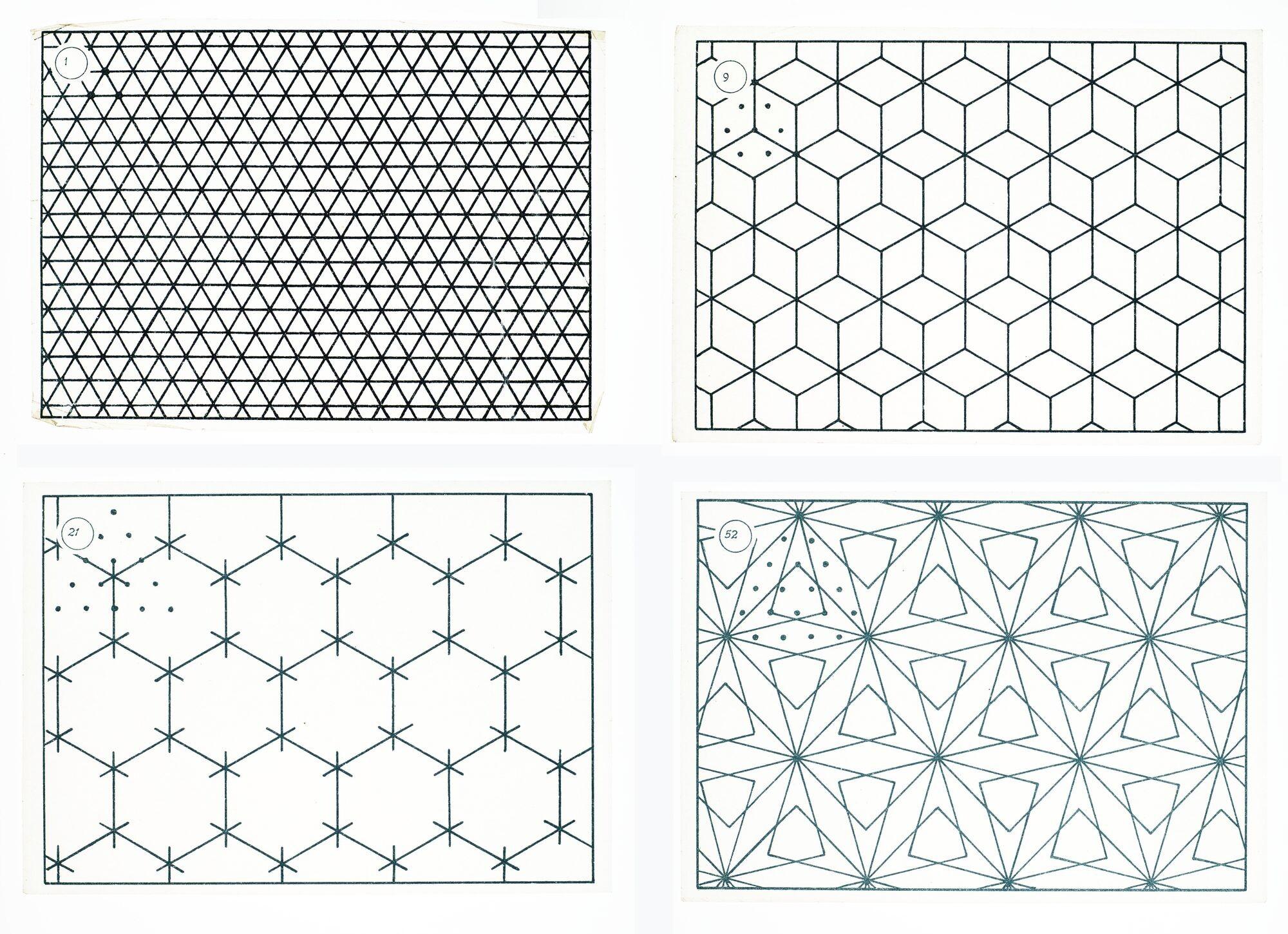 Diesem Grundsatz verlieh Ostwald in der Mappenfolge mit zahlreichen Beispielen geometrisch konstruierter Flächenteilungen Nachdruck. In Mappe 1 widmete er sich dem Dreieck als Grundmuster. Dabei ging er zunächst von einem Einzeldreieck aus, das nur über seine drei Seiten und Eckpunkte verfügt und dadurch lediglich ein gleichförmiges Netz ergibt. Durch die Erweiterung dieses Dreiecks zu größeren, aus 4, 9, 16 und schließlich 25 gleichförmigen Teildreiecken bestehenden Elementen mit entsprechend mehreren Knotenpunkten der Dreiecksspitzen, ergeben sich in Ostwalds Formenwelt ungezählte Möglichkeiten, regelmäßig angeordnete Figuren in diese Strukturen einzutragen. Durch Spiegelung bzw. Drehung lassen sich diese zu einem nahtlosen, praktisch unbegrenzten Netz erweitern.