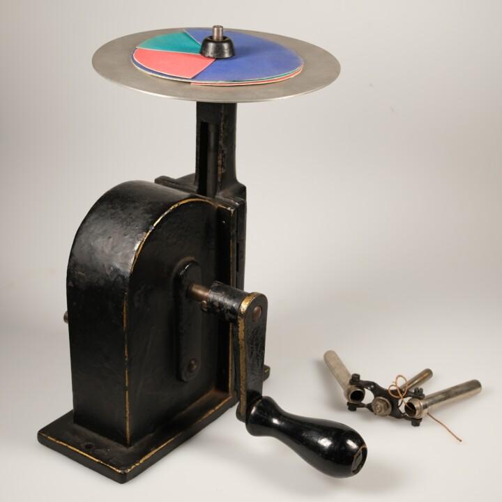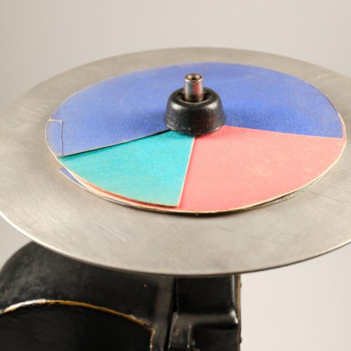 Dazu tauschte er den Rotor der Handzentrifuge gegen eine Metallscheibe aus. Auf diese werden farblich unterschiedlich bestrichene Papierscheiben aufgesetzt, deren Farben durch schnelle Rotation der Drehscheibe in der Wahrnehmung durch das Auge miteinander vermischt werden. Hierzu werden seit Maxwell – James Clerk Maxwell hatte 1857 die Farbkreiselmethode zu Farbvergleichsmessungen erfunden – die Scheiben mit einem Schlitz versehen und ineinandergesteckt. Ein Prinzip das Ostwald seit Schulzeiten kannte: