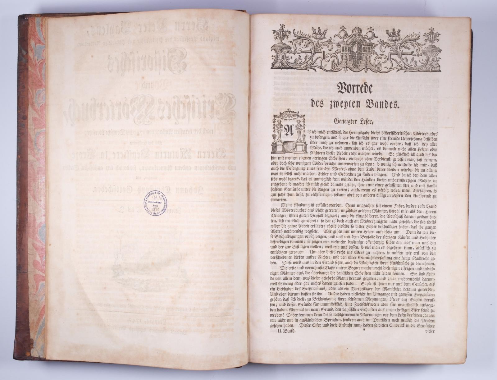 Das „historische und critische Wörterbuch“ ist die deutsche Übersetzung des französischen „Dictionnaire historique et critique“ von Pierre Bayle (1647–1706). Die deutsche Ausgabe erschien in vier Bänden zwischen 1741 und 1744 in Leipzig im Verlag Breitkopf. Johann Christoph Gottsched (1700–1766) war Leiter des Übersetzungsprojekts und bekannt als einflussreicher Theoretiker und Vermittler der Frühaufklärung in Deutschland. Die deutsche Übersetzung zum „historischen und critischen Wörterbuch“ wurde teils von Gottsched selbst, aber auch von seiner Frau Luise Gottsched (1713–1762) sowie weiteren Mitarbeitern seines sogenannten „Kreises“ erstellt. Die deutsche Edition war bibliografisch wichtig, da sie das akkumulierte Wissen einem größeren deutschen Leserkreis verfügbar machte, allerdings in einer bearbeiteten, teils entschärften Form. Gottsched verfasste das Vorwort und Anmerkungen, besonders für Stellen, die er als „anstößig“ betrachtete.