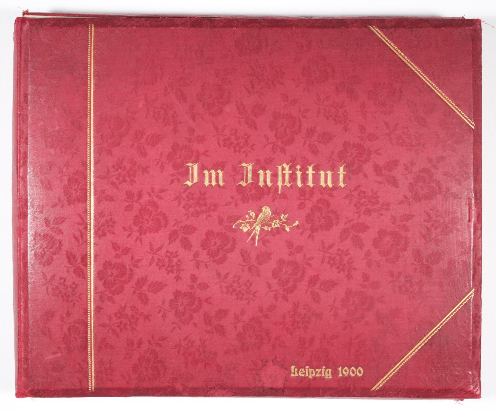 Wilhelm Ostwald (1853–1932) arbeitete von 1887 bis 1906 als Professor für Chemie an der Universität Leipzig. Im Jahr 1898 wurde das neue Physikalisch-chemische Institut in der Leipziger Linnéstraße 2 eröffnet, von den Chemikern kurz „Institut“ genannt. Die Fotomappe „Im Institut“ beinhaltet 14 lose innenliegende Fotos aus der Zeit um 1900, die das Institutsgebäude von außen und innen zeigen sowie die Menschen, die darin arbeiteten. Das Gebäude war zur Zeit seiner Eröffnung modern eingerichtet mit Arbeits- und Geräteräumen sowie zwei Hörsälen für das Studium der Chemie. Mittig des Gebäudeensembles, in einem separaten Gebäude befand sich die Direktorenwohnung, in der Wilhelm Ostwald mit seiner Frau und den gemeinsamen fünf Kindern wohnte und arbeitete. Beide Gebäude waren durch einen Übergang miteinander verbunden. In einer Glasveranda mit Freitreppe in den Garten befand sich Wilhelm Ostwalds bevorzugter Arbeitsplatz.