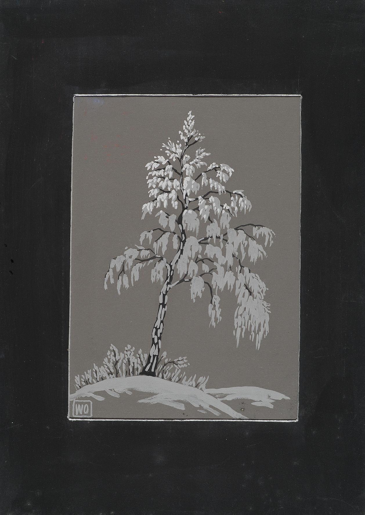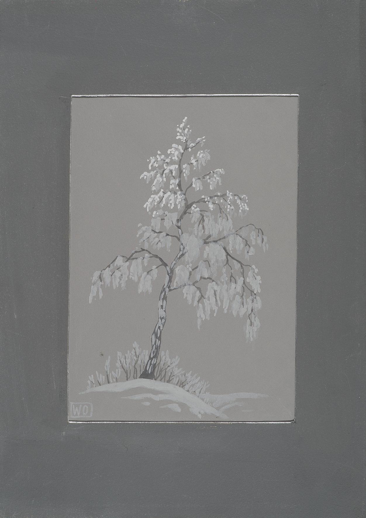 Unter den Grauharmonien Ostwalds hat sich neben zahlreichen anderen Motiven eine Serie mit dem Motiv einer winterlich verschneiten Birke in der Sammlung überliefert. Das weitgehend identisch wiederholte Motiv des leicht nach rechts geneigten Baums auf verschneitem Boden ist dabei aus jeweils vier Tönen der Ostwaldschen Grauleiter gebildet, die auf den Rückseiten der Blätter vermerkt sind. Die von Ostwald im Zuge seiner messenden Farbforschung definierten Graustufen beginnen mit der Bezeichnung »a« bei Weiß und reichen ursprünglich bis »u«. Laut Ostwalds eigener Erkenntnis ist die Abstufungen auf dieser Skale jedoch für die Praxis zu eng und so strich er jede zweite Stufe aus der Grauleiter. Auch ließ sich im Bereich von Schwarz laut Ostwald kein tieferer Ton als »p« herstellen, weswegen die Werte »q-r-s-t« ebenfalls entfielen, woraus sich die Abfolge »a-c-e-g-i-l-n-p« ergab, die letztlich in Ostwalds Farbsystem Anwendung fanden.