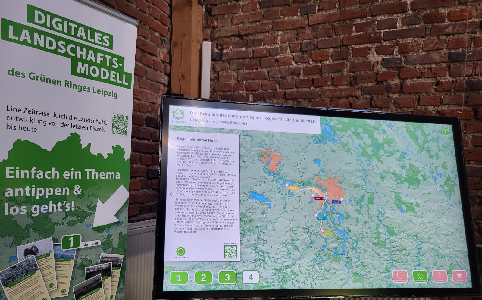 Regionalspezifisch ergänzt das digitale Landschaftsmodell des Grünen Ringes Leipzig die Schau. Das Modell offeriert in vier Unterthemen eine digitale Zeitreise durch die Entwicklung unserer Landschaft, von der letzten Eiszeit bis heute. Dargestellt wird das Gebiet und Umfeld des Grünen Ringes Leipzig mit Bezug zur Braunkohle, deren Abbau in den letzten 150 Jahren besonders landschaftsprägend war. Mit dem Tablet lassen sich zusätzliche Informationen beeindruckend in Augmented-Reality darstellen. Das herumlaufende Eiszeit-Mammut und weitere 3D-Inhalte lassen sich direkt auf den Touchscreen beamen.